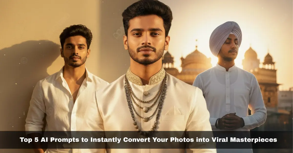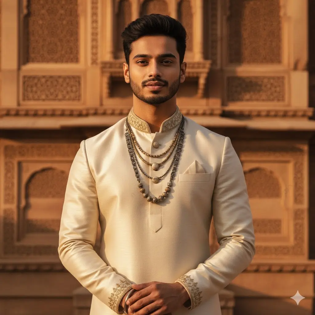 Ultra-realistic 4K portrait of a young Indian man with 100% accurate facial features, styled like a modern-day maharaja. He stands in front of an ancient sandstone palace during sunset, wearing a tailored ivory sherwani with subtle embroidery and layered oxidized jewelry. The golden light hits his face with a regal glow. The atmosphere blends royalty and modern masculinity — cinematic depth, detailed textures, and warm color tones inspired by vintage Vogue India editorials.