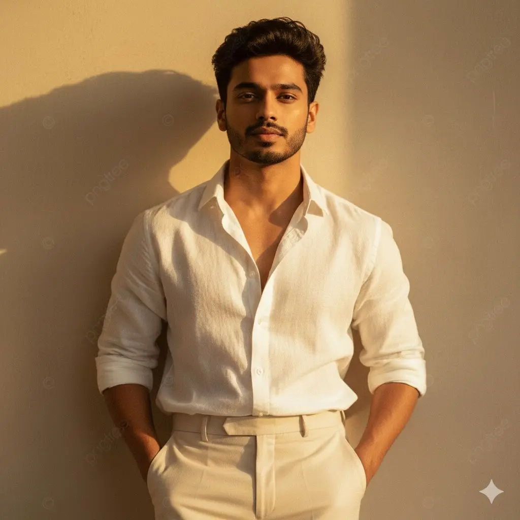 Ultra-realistic 4K editorial portrait of a young Indian man, preserving the uploaded face with 100% accuracy. He stands effortlessly against a subtly textured wall, bathed in soft, golden-hour sunlight that casts graceful, warm shadows across his face and outfit. He wears a pristine white linen shirt, casually unbuttoned at the collar, paired with tailored high-waisted cream trousers. His hands rest loosely in his pockets, exuding effortless charm and quiet confidence. His hair is gently tousled, glowing at the edges where the sunlight catches it. The scene captures a cinematic balance of nostalgia and sophistication — warm tones, soft film grain, and a refined vintage aesthetic reminiscent of timeless fashion editorials.
