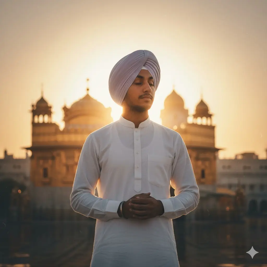 A young Indian Sikh man in a minimal modern kurta with a pastel turban stands before a glowing temple silhouette. Golden rays create a dreamy halo around him. Background softly blurred to focus on emotion — devotion, peace, and modern faith. Retro cinematic color grading, warm tones, and gentle grain for a timeless Gurpurab aesthetic.
