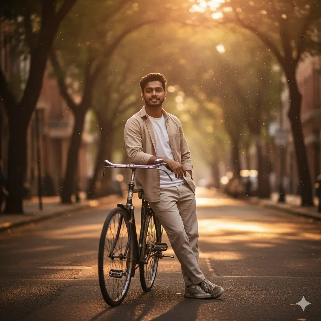 Ultra-realistic 4K cinematic portrait of a young Indian man (preserve face exactly), leaning casually on a bicycle in a quiet urban street bathed in golden-hour light. He wears a loose beige overshirt and white T-shirt with relaxed trousers. Dust particles dance in the sunlight around him. Mood is nostalgic yet modern — inspired by 90s film photography, soft focus, lens flare, and rich orange tones.