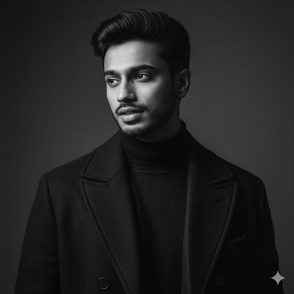 Ultra-detailed black-and-white portrait of a young Indian man with 100% facial accuracy. He wears a black turtleneck and a long overcoat, looking slightly away from the camera with intense confidence. Studio lighting with strong contrast, deep shadows, and cinematic film grain. A timeless magazine cover look inspired by classic Hollywood portraiture and Vogue Men editorial style.