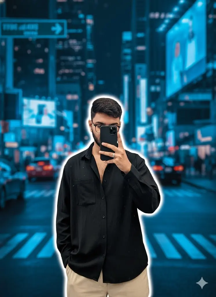 A young man takes a mirror selfie, his face covered by a dark phone. He’s wearing a jet-black, loose-fit shirt with the top buttons casually open, and light beige trousers. A minimal silver ring on his right hand. The background is a glowing, electric-blue city collage — blurred street signs, skyscraper lights, traffic streaks, and glowing billboards layered together in motion blur. Soft neon reflection on his clothes, cool-toned lighting with a sharp white outline glow tracing his silhouette. The atmosphere feels cinematic, late-night urban style, trendy Instagram portrait in HD realism, perfectly balanced composition, portrait aspect ratio.