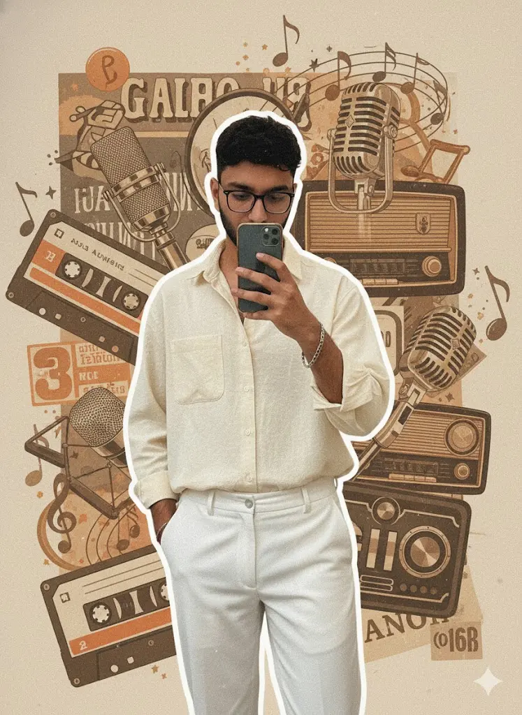 A stylish young man stands confidently, holding a phone in front of his face. He’s wearing a cream oversized shirt tucked loosely into white pants, paired with a silver chain bracelet. The background is a vintage collage of cassette tapes, music notes, microphones, old radios, and faded typography in warm beige and muted orange hues. Subtle grain texture gives a retro magazine feel. A faint glowing white border outlines his figure. The lighting is soft and natural, evoking nostalgia with a modern edge, perfectly detailed Instagram edit with realistic shadows and HD clarity, portrait framing.