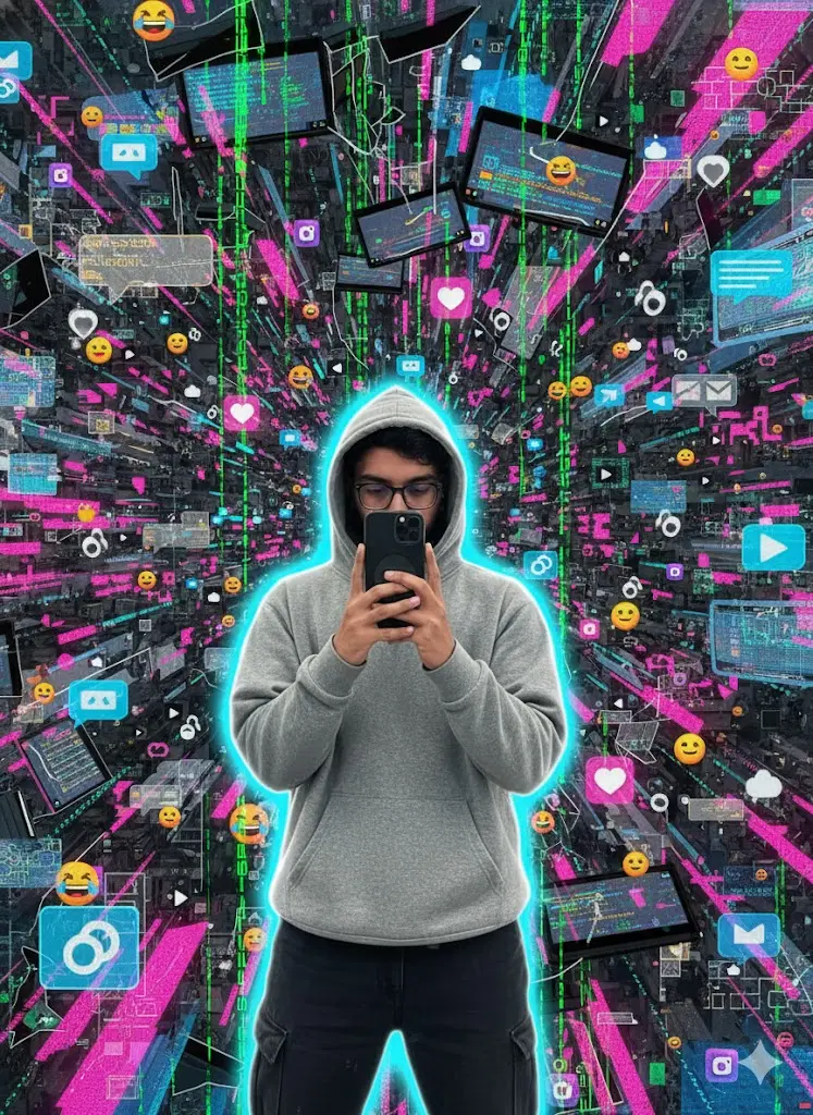 A young man takes a mirror selfie wearing a gray oversized hoodie and casual pants. His face is covered with a black smartphone. The background explodes with layered digital chaos — glitch textures, broken computer screens, binary code lines, chat bubbles, emojis, and holographic icons merging into one another. Cool cyan and magenta tones dominate the lighting. A soft luminous outline surrounds his silhouette. The atmosphere feels futuristic and chaotic yet stylish — a visual metaphor for modern digital life. Realistic lighting, detailed reflections, high-definition Instagram aesthetic, perfectly proportioned portrait frame.