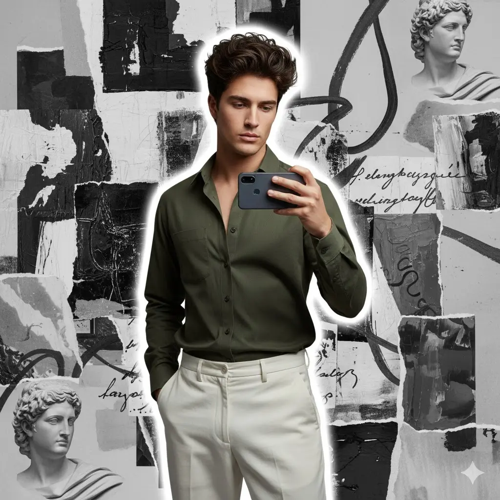 A stylish young man poses with one hand in his pocket and the other holding his phone before his face. He’s dressed in a dark olive shirt and off-white pants, his hair voluminous and slightly messy. The background is an artistic monochrome collage — abstract paintings, Greek statues, torn paper textures, and handwritten brush strokes with black-gray tones. A subtle white halo glow outlines the figure. Lighting is balanced with soft shadows and depth. Realistic HD portrait composition, moody aesthetic edit blending art and fashion, Instagram-modern atmosphere with cinematic contrast.