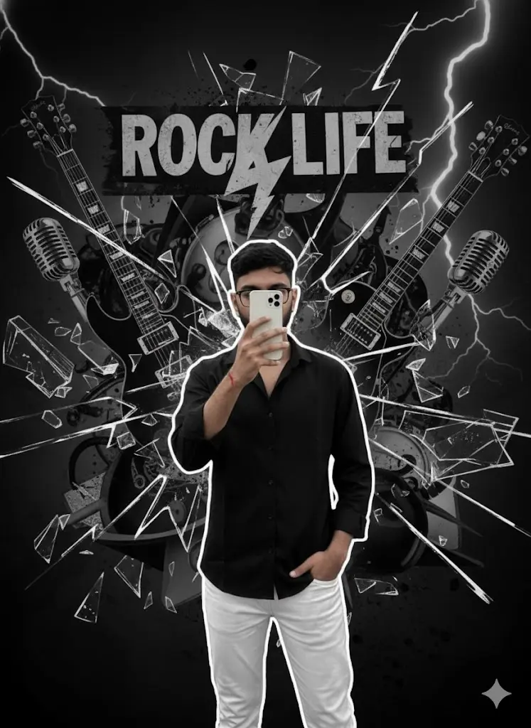 A young man in a loose black open-collar shirt and slim white trousers poses with confident simplicity, one hand in pocket, the other holding a white-cased phone hiding his face. The background is a dark grayscale collage of electric guitars, microphones, shattered glass, lightning streaks, and bold word art saying “ROCK LIFE.” Dramatic lighting with reflections adds energy. A thin white neon glow defines his shape. The mood is edgy, intense, and cinematic — perfect HD portrait edit for modern Instagram fashion trends.