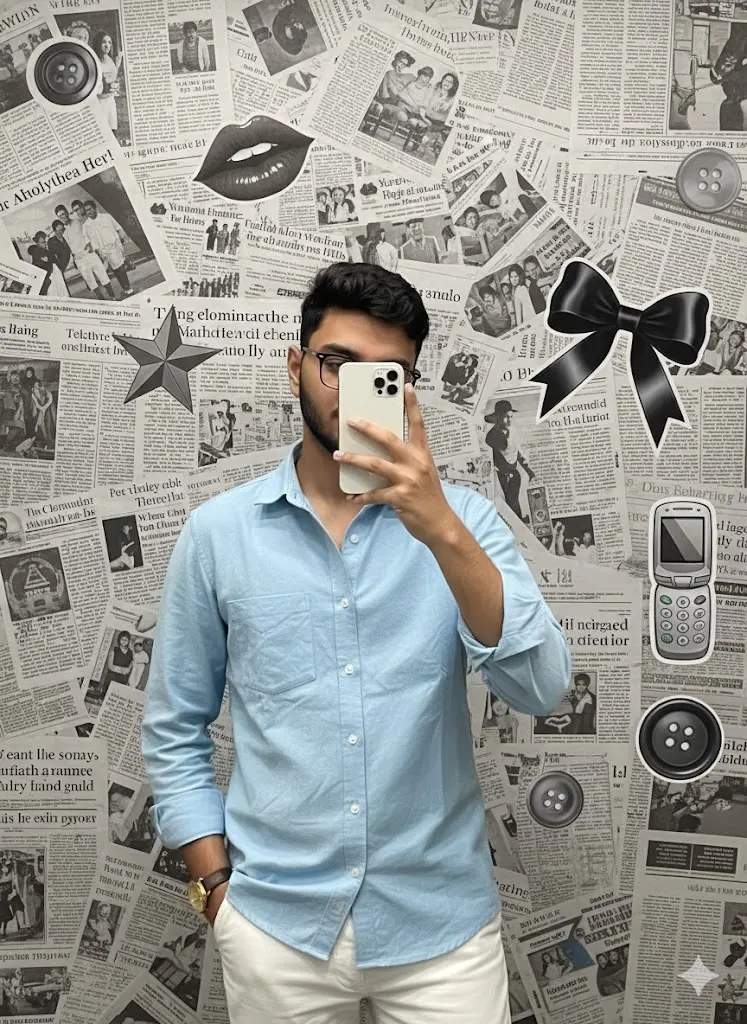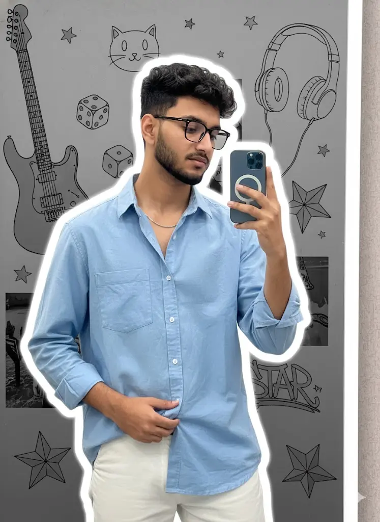 A stylish young man taking a mirror selfie, wearing a sky blue loose shirt and white pants, holding the shirt casually with one hand, minimal jewelry, curly hair, realistic lighting, and soft white outline glow around him. The background is a modern grayscale aesthetic collage with elements like electric guitar, headphones, dice, cat face decor, 3D stars, and “STAR” graffiti text. Artistic, trendy, Instagram-style edit with balanced composition and HD quality, same proportions as portrait photo.A stylish young man taking a mirror selfie, wearing a sky blue loose shirt and white pants, holding the shirt casually with one hand, minimal jewelry, curly hair, realistic lighting, and soft white outline glow around him. The background is a modern grayscale aesthetic collage with elements like electric guitar, headphones, dice, cat face decor, 3D stars, and “STAR” graffiti text. Artistic, trendy, Instagram-style edit with balanced composition and HD quality, same proportions as portrait photo.